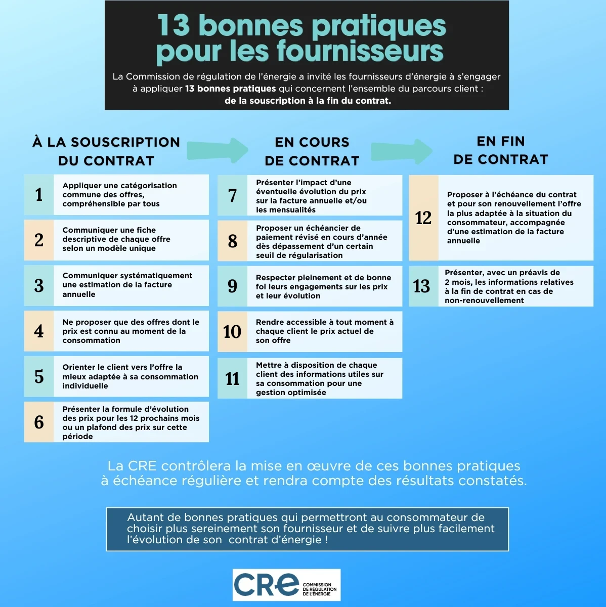 Afin de renforcer la confiance entre fournisseurs et consommateurs, la CRE a défini 13 mesures pour améliorer la lisibilité des offres pour les consommateurs et leur garantir ainsi une meilleure protection.